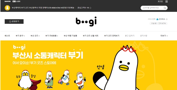 [파이낸셜경제=박영진 기자] 부산시는 부산시 소통 캐릭터 '부기' 상품을 한곳에서 구매할 수 있는 네이버 스마트스토어 '부기타운'을 운영한다고 밝혔다.