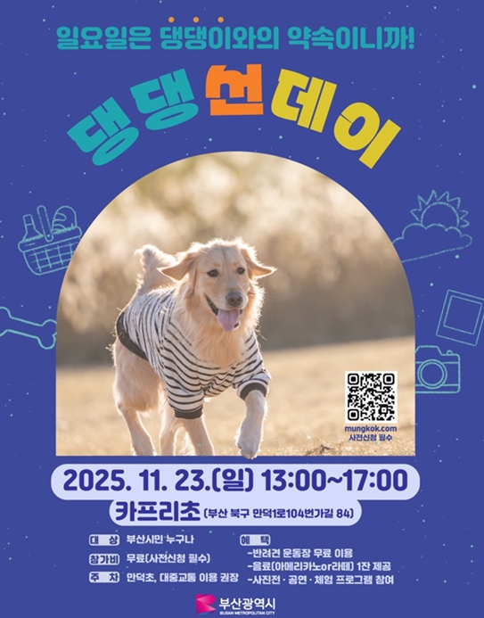 [파이낸셜경제=박영진 기자] 부산시는 오는 11월 23일 오후 1시부터 5시까지 카프리초(북구 만덕동 소재) 내 반려견 운동장에서 '댕댕 선데이(반려동물 동반 피크닉 체험 행사)'를 개최한다고 밝혔다.