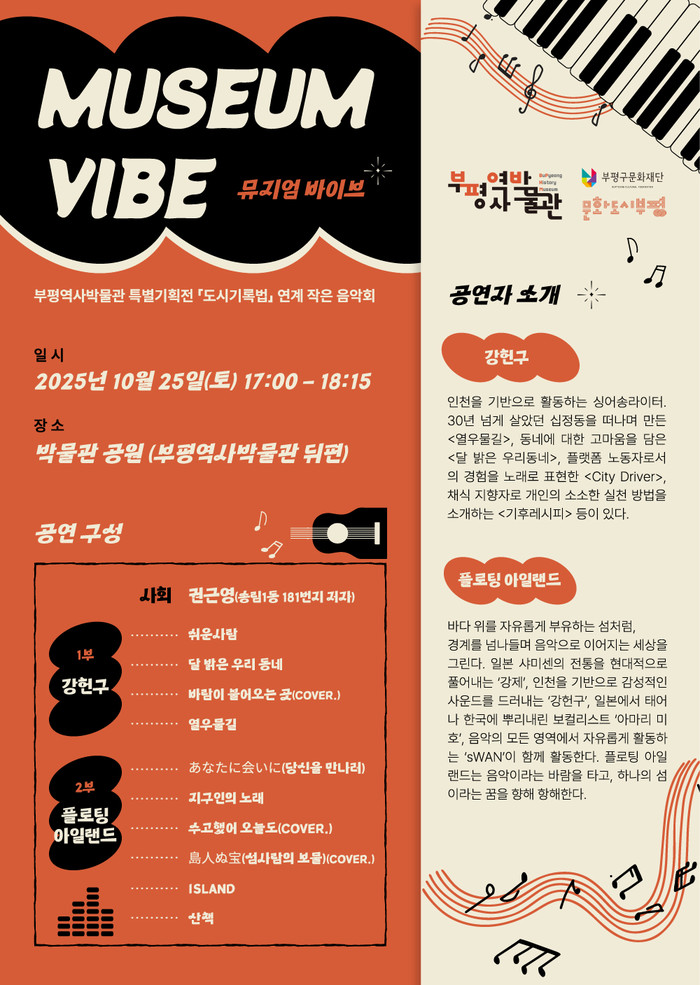 이번 음악회는 박물관에서 개최 중인 특별기획전 ‘도시기록법: 우리가 부평을 기억하는 방법’과 연계된 행사이다. 그동안 음악으로 부평의 기억들을 표현해 온 싱어송라이터 강헌구가 전시에 참여한 데 이어, 작은음악회에 출연한다.