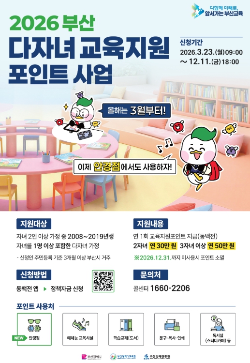 [파이낸셜경제=박영진 기자] 부산광역시교육청은 저출생 문제에 대응하고 학부모의 교육비 부담을 덜어주기 위한 지원책의 하나로 다자녀가정에 지급하는 ‘교육지원포인트’ 신청을 23일부터 접수받는다고 밝혔다.