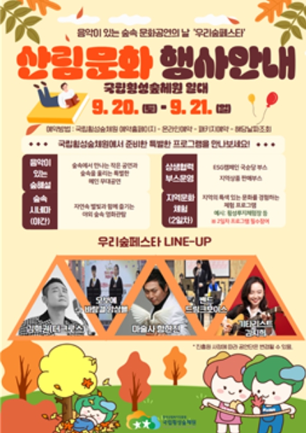 행사 첫날에는 ‘음악이 있는 숲해설’을 주제로 숲속 곳곳에서 소규모 공연과 숲 해설이 진행되며, ▲마술사 함현진 ▲발달장애인 밴드 드링크보이스▲기타리스트 김지희 ▲초청가수 김혁건(더크로스) 등의 숲속 공연을 선보인다.
