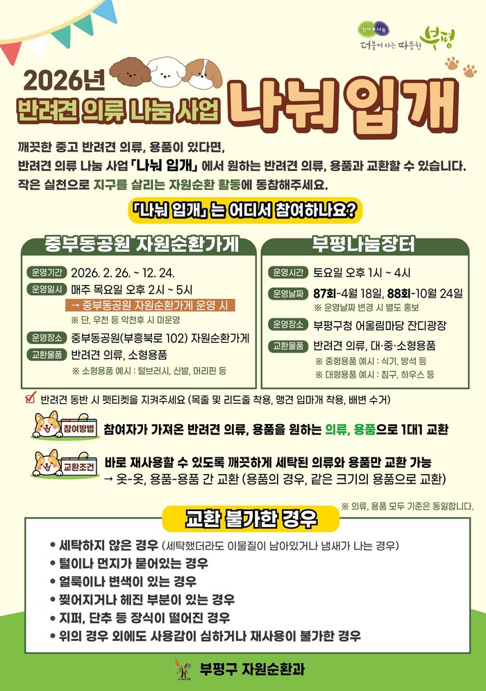 ‘나눠 입개’는 2026년 부평구가 새롭게 추진하는 자원순환 사업으로, 사용하지 않는 반려견 의류와 용품을 주민 간에 교환함으로써 폐기물 발생을 줄이고 자원순환 실천 문화를 확산하고자 마련됐다.