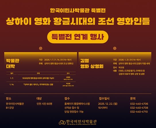 [파이낸셜경제=김기보 기자] 인천광역시 시립박물관 분관 한국이민사박물관은 특별전 〈상하이 영화 황금시대의 조선 영화인들〉과 연계해 유명 작가 초청 특강을 개최한다고 밝혔다.