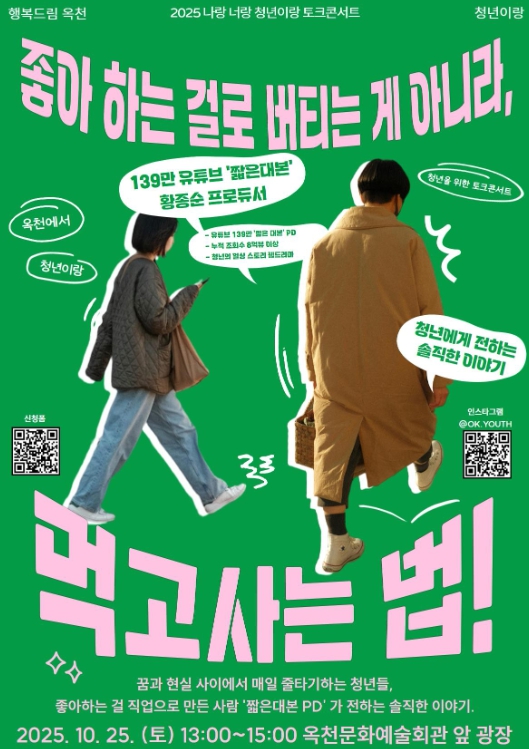[파이낸셜경제=김기보 기자] 옥천군은 오는 10월 25일 오후 1시, 문화예술회관 앞 광장에서 청년의 관심사와 목소리를 반영한 '2025년 청년 토크콘서트' 1회차 ‘청년이 청년에게’를 개최한다.