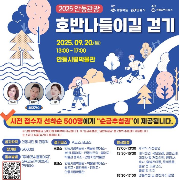 [파이낸셜경제=김지훈 기자] 안동시는 오는 9월 20일 오후 1시, 안동시립박물관 특설무대와 호반나들이길에서 ‘제12회 안동 관광 호반나들이길 걷기’ 행사를 개최한다.