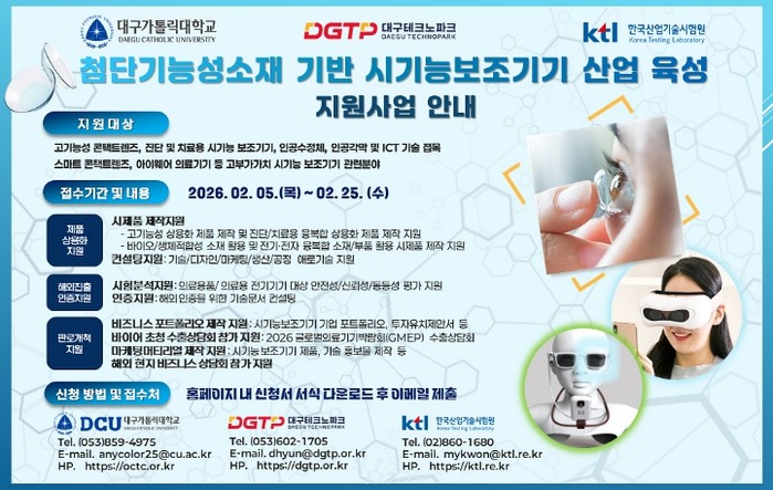 [파이낸셜경제=김지훈 기자] 대구광역시는 산업통상부, 경상북도와 함께 ‘2026년 첨단 기능성 소재 기반 시(視)기능 보조기기 육성사업’을 본격 추진하고, 참여기업을 모집한다.