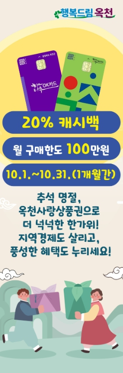 옥천군이 2025년 본예산에 군비를 적극 반영하는 등 선제적 재정 운영을 통해 이번 혜택을 마련해 10월 한 달 동안 군민들은 옥천사랑상품권을 월 100만 원 사용 시 최대 20만 원의 캐시백 혜택을 받을 수 있게 됐다.