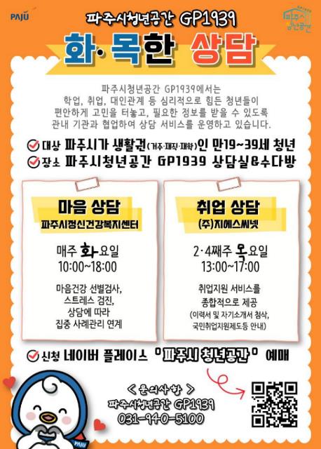| ▲ 파주시청년공간 지피(GP)1939, ‘화·목한 상담’ 참여자 상시 모집 |