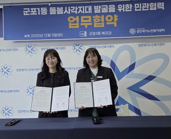 협약을 맺은 성민재가노인복지센터는 노인맞춤돌봄서비스 수행기관으로 독거노인 생활관리사를 활용하여 군포1동 저소득 독거노인을 전수조사하고 고독사 위험군에 포함되는 독거노인을 찾아 군포1동 복지과와 협업하여 노인맞춤돌봄서비스 등을 지원 할 예정이다.