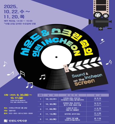 [파이낸셜경제=김기보 기자] 인천광역시 인천도시역사관은 오는 10월 22일부터 일반 시민을 대상으로 ‘도시학당-사운드&스크린 속의 인천’을 운영한다고 밝혔다.