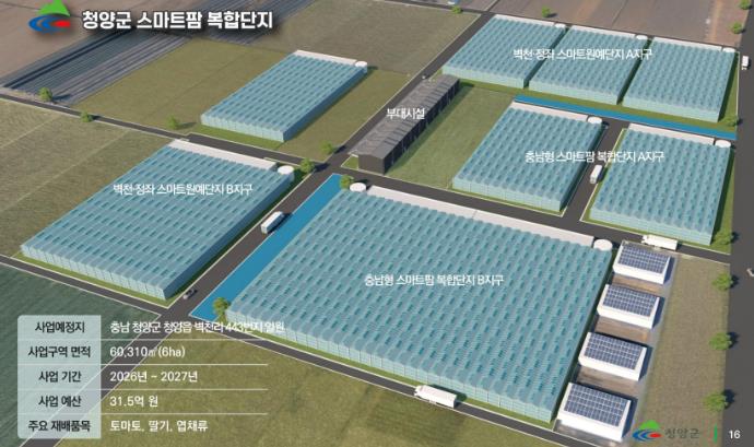 확보된 예산으로 청양읍 벽천리 443번지 일원 6ha 부지에 4.51ha 규모의 온실과 지열 냉‧난방 기반시설을 조성할 계획이다.