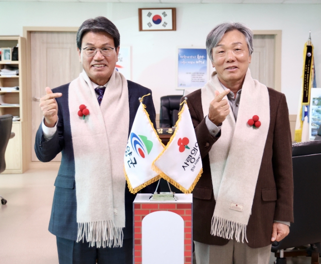 | ▲ 김돈곤 군수(왼쪽)와 충남사회복지공동모금회 성우종 회장(오른쪽)이 함께 포즈를 취하고 있다. |