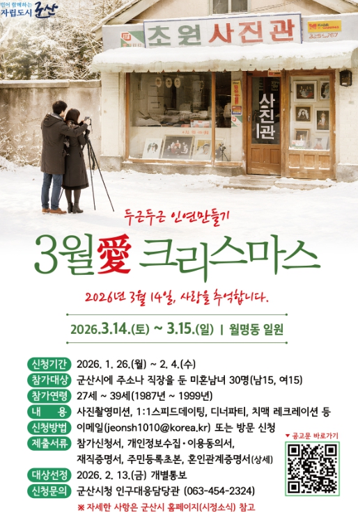 [파이낸셜경제=김예빈 기자] 군산시가 2월 4일까지 선남선녀의 두근두근 인연만들기 행사 ‘3월愛 크리스마스’ 참가자를 모집한다.