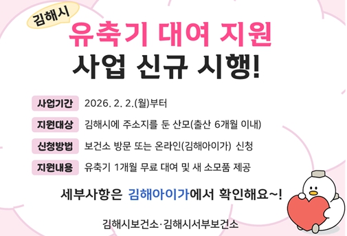 [파이낸셜경제=김예빈 기자] 김해시는 출산가정의 경제적 부담을 완화하고 건강한 양육 환경 조성을 위해 오는 2월 2일부터 ‘유축기 대여 지원 사업’을 본격적으로 시행한다고 29일 밝혔다.