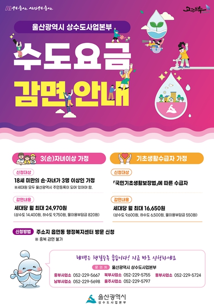 [파이낸셜경제=김예빈 기자] 울산시 상수도사업본부는 지난해에 이어 올해도 관내 3자녀(손자녀 포함) 이상 가정 및 기초생활수급자를 대상으로 상·하수도 요금 감면 혜택을 지원한다고 밝혔다.