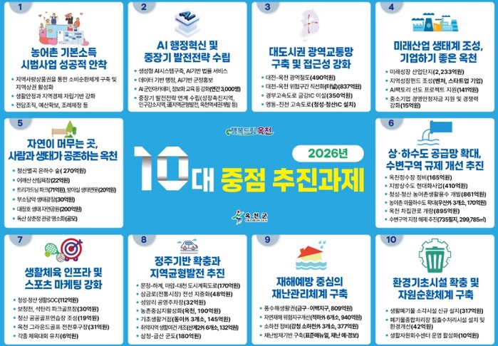 [파이낸셜경제=김기보 기자] 옥천군이 26일 2026년 군정 운영의 핵심 방향을 담은 10대 중점 추진과제를 발표하고, 군민 삶의 질 향상과 지속가능한 지역성장을 위한 정책 추진에 나선다.