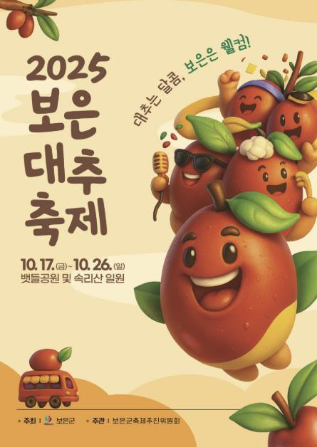 보은대추축제는 매년 깊어가는 가을의 정취와 함께 전국적인 명성을 얻으며 충청권을 대표하는 가을 축제로 자리매김해 왔다. 올해 축제는 ‘대추는 달콤, 보은은 웰컴!’이라는 주제로, 농·특산물 판매뿐 아니라 먹거리, 놀거리, 볼거리를 고루 담아내 지역민과 관광객 모두를 만족시킬 예정이다.