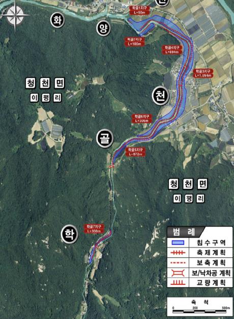 학골지구에는 2029년까지 4년간 123억 원을 투입해 청천면 송면리~이평리 구간 소하천 3.42㎞ 정비, 교량 4개소 재가설, 가동보 1개소 설치가 진행된다.