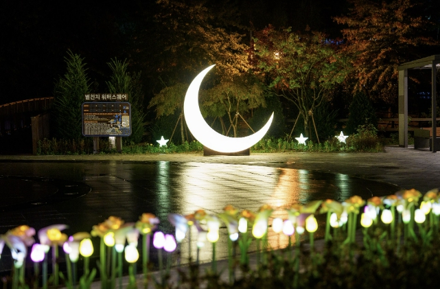 별천지공원과 삼기저수지 일대에 조성된 경관조명이 은은하게 켜지며 낮과는 다른 분위기의 산책로가 펼쳐진다.