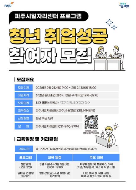 모집 기간은 2월 2일부터 2월 24일까지이며, 교육은 3월 4일부터 3월 5일까지 파주시 일자리센터에서 집합교육으로 진행된다. 이후 3월 6일부터 4월 10일까지는 참여자별 취업 준비 상황에 맞춘 1:1 맞춤 지도가 운영될 예정이다.