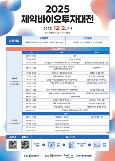 [파이낸셜경제=김기보 기자] 인천광역시가 주최하고 인천관광공사와 KOTRA, 한국제약바이오협회가 공동 주관하는 ‘제약바이오투자대전’이 오는 12월 2일 인천 송도컨벤시아 프리미어볼룸에서 열린다.