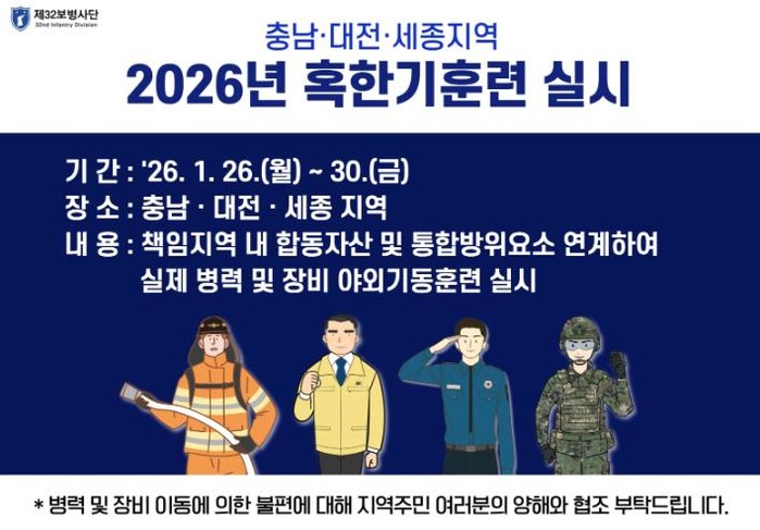 [파이낸셜경제=김영란 기자] 육군 제32보병사단은 오는 1월 26일부터 30일까지 충남ㆍ대전ㆍ세종 지역에서 동계 통합 방위 작전 확립을 위한 혹한기 훈련을 진행한다.