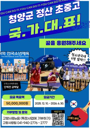 한편, 군은 지난해 12월 10일부터 ‘정산 초·중·고 탁구부 꿈 키우기 프로젝트 시즌3’ 모금을 시작해 사업의 동력을 이어가고 있다.