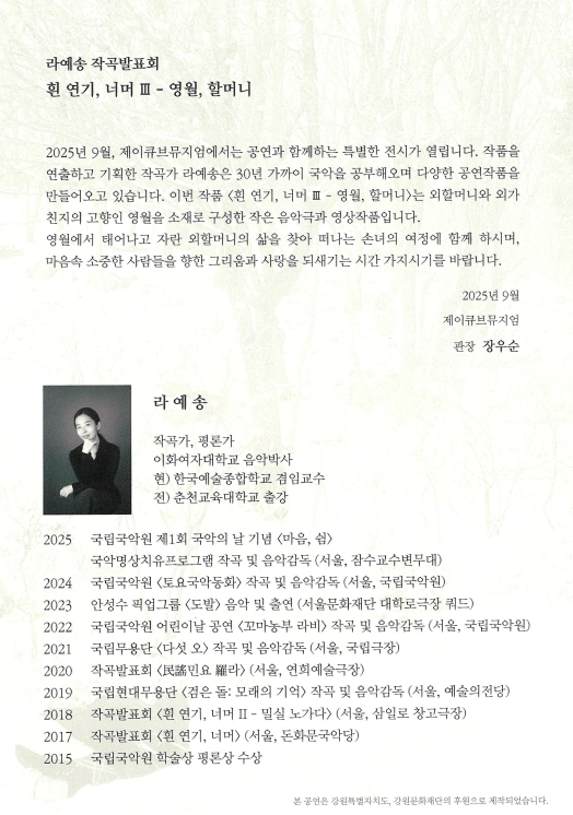 오는 9월에는 초대전 [흰 연기, 너머Ⅲ-영월, 할머니]와 함께 ‘라예송 작곡발표회’가 제이큐브뮤지엄에서 열린다.