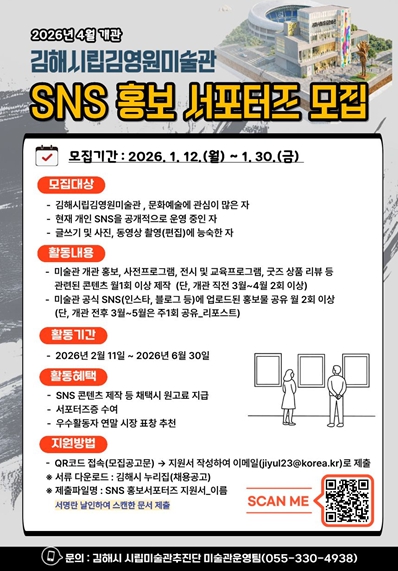 [파이낸셜경제=김예빈 기자] 김해시는 오는 2026년 4월 개관 예정인 ‘김해시립김영원미술관’을 알리고, 미술관의 개관 과정을 생생하게 기록하고 홍보할 'SNS 홍보 서포터즈'를 모집한다고 밝혔다.