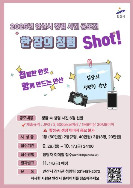 [파이낸셜경제=김기보 기자] 안산시는 청렴문화 확산과 시민 공감대 형성을 위해 ‘2025 한 장의 청렴, Shot! 사진 공모전’을 개최한다고 30일 밝혔다.