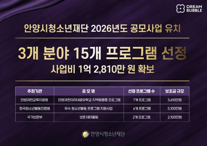 | ▲ 안양시청소년재단, 공모사업 3개 분야 15개 프로그램 선정…1억 2,810만 원 유치 |