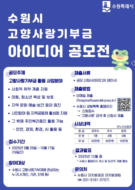 수원시 관계자는 “이번 공모전은 전 국민이 참여해 수원의 미래를 함께 만들어가는 참여형 프로젝트”라며 “기부자와 시민의 아이디어가 정책으로 실현되도록 노력해 고향사랑 기부제가 지역 발전의 실질적 성과로 이어지게 하겠다”고 말했다.