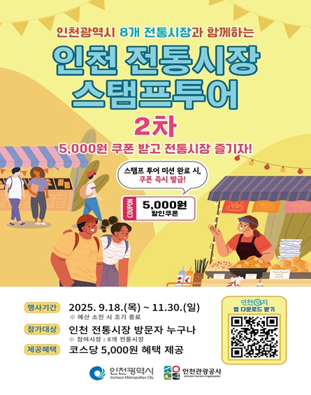 [파이낸셜경제=김기보 기자] 인천광역시와 인천관광공사는 전통시장의 매력을 널리 알리고 지역 경제 활성화를 도모하기 위해 ‘매력으뜸 전통시장 육성사업’의 일환으로 오는 9월 18일부터 11월 30일까지 ‘2025년 제2차 인천 전통시장 모바일 스탬프투어’를 개최한다고 밝혔다.