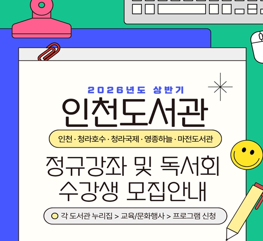 [파이낸셜경제=김기보 기자] 인천광역시 인천도서관 및 분관(청라호수·청라국제·영종하늘·마전도서관)은 오는 3월부터 2026년 상반기 정규강좌 프로그램을 운영한다고 밝혔다.