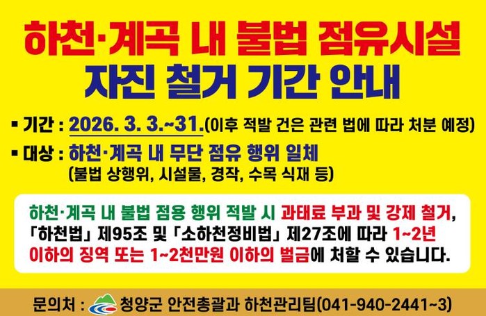 관내 지방하천과 소하천, 주요 계곡 일대에 대한 전수조사를 실시해 무단 점용 현황을 면밀히 파악하는 한편, 사전 안내를 통해 위반 행위자의 자발적인 철거와 원상복구를 유도할 방침이다.