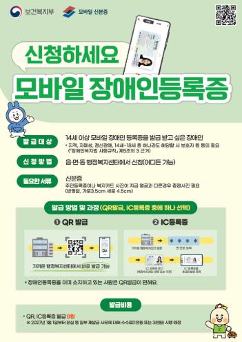 IC칩이 탑재된 신규 장애인등록증 소지자는 ‘대한민국 모바일 신분증’ 애플리케이션을 통해 스마트폰 태깅 방식으로 간편하게 등록할 수 있으나, 기존 실물 장애인등록증 소지자는 가까운 읍·면·동 행정복지센터를 방문해 정보인식부호(QR코드) 인증 절차를 거쳐야 발급받을 수 있다.