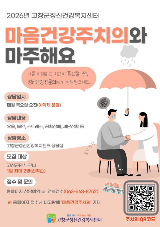 [파이낸셜경제=김예빈 기자] 고창군 정신건강복지센터가 지역주민의 마음 건강 증진을 위해 2026년 마음건강주치의 사업을 운영하고 있다.
