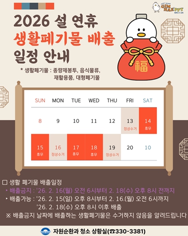 이번 설 연휴 5일동안 수거 대행업체의 휴무일은 2월 14일, 15일, 17일, 18일로, 2월 16일에만 정상 수거를 실시한다.