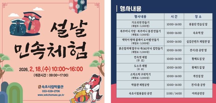 정종천 박물관장은 “설 명절을 맞아 시민과 관광객이 함께 전통문화를 체험하며 따뜻한 명절 추억을 만들 수 있도록 이번 행사를 마련했다”며 “앞으로도 속초시립박물관이 지역의 역사와 문화를 공유하는 열린 문화공간으로 자리매김할 수 있도록 다양한 프로그램을 지속적으로 추진하겠다”고 말했다.