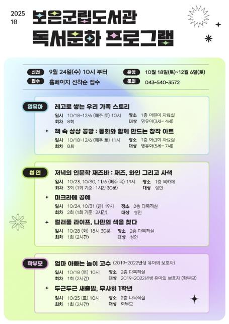[파이낸셜경제=김기보 기자] 보은군립도서관은 오는 24일 오전 10시부터 ‘2025년 하반기 프로그램’ 수강생 모집에 들어간다. 이번 프로그램은 유아, 성인, 부모 등 다양한 계층을 대상으로 총 7개 강좌가 마련됐다.