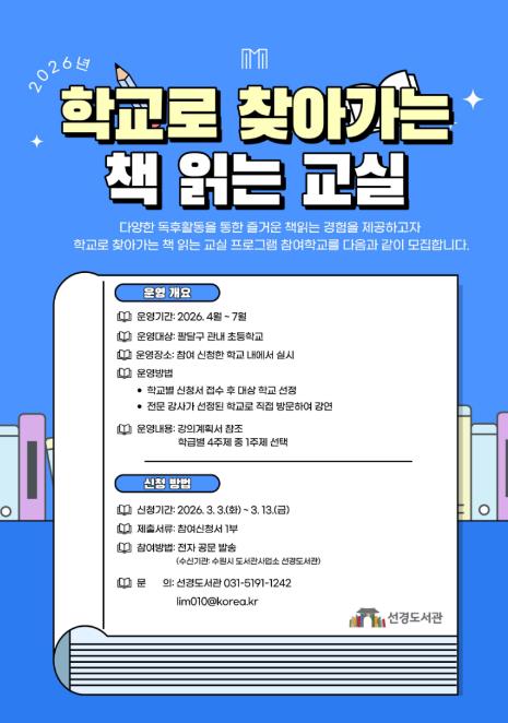 [파이낸셜경제=김기보 기자] 수원시 선경도서관은 ‘2026년 학교로 찾아가는 책 읽는 교실’에 참여할 팔달구 관내 초등학교를 13일까지 모집한다.