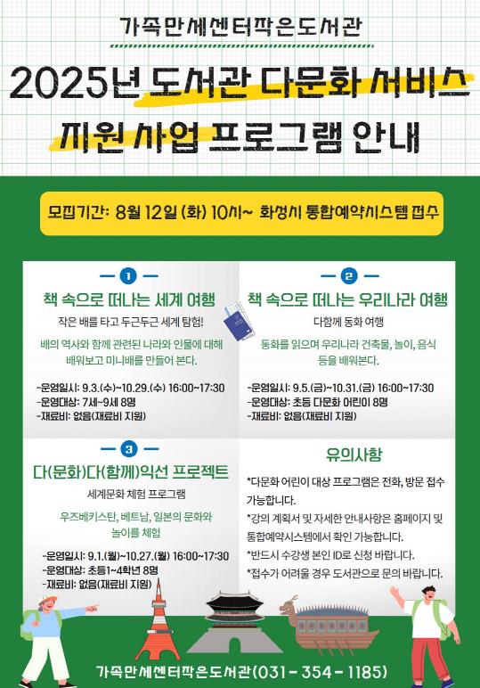 [파이낸셜경제=김기보 기자] 화성시문화관광재단 가족만세센터작은도서관은 오는 9월부터 11월까지 ‘2025 도서관 다문화 서비스 지원사업’ 프로그램을 운영한다. 이번 사업은 문화체육관광부 주관 공모에 선정된 프로그램으로, 지역 어린이들의 다문화 수용성과 상호 문화 교류를 촉진하기 위해 기획됐다.