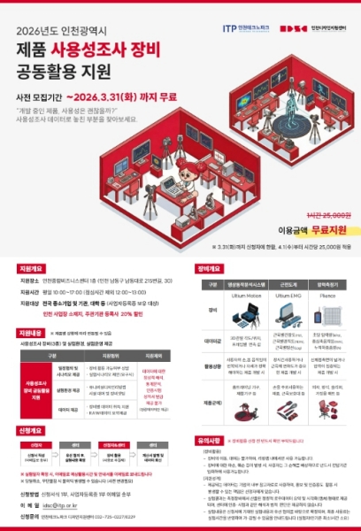 이번 사업은 실제 사용자의 체험을 기반으로 제품·서비스의 편리성과 안전성을 분석하는 사용성조사 장비 지원과, 실물 수준 출력이 가능한 고성능 3D프린팅 지원을 포함한다. 인천종합비즈니스센터 1층 유니버설디자인리빙랩에서 운영되며, 제품 개선 방향 도출부터 시제품 제작까지 연계 지원한다.