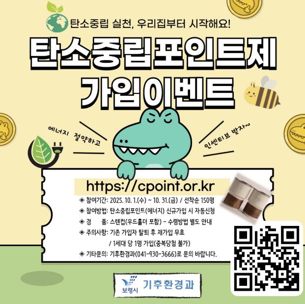 [파이낸셜경제=김영란 기자] 보령시는 탄소중립 실현과 온실가스 감축을 위한 시민 참여 확대를 목표로 탄소중립포인트제 에너지 분야 신규가입자 대상 기념품 증정 이벤트를 10월 31일까지 실시한다고 밝혔다.