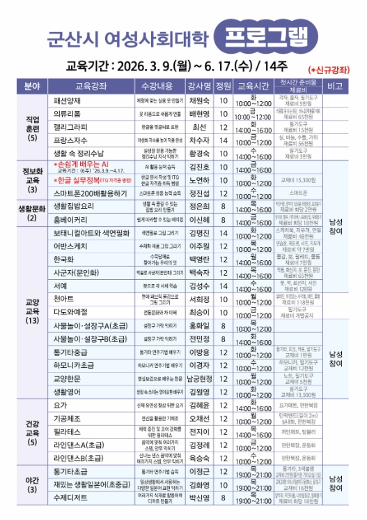 [파이낸셜경제=김예빈 기자] 군산시 여성사회대학이 오는 2월 24일부터 27일까지 상반기 프로그램 수강생을 선착순 모집한다.