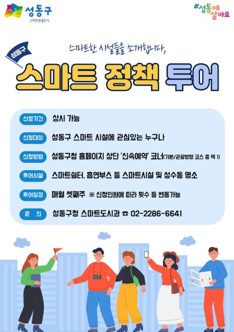 투어는 매월 셋째 주에 진행하며 신청 인원 등에 따라 일부 조정될 수 있다. 참여 신청은 성동구 스마트 시설에 관심 있는 누구나 성동구청 누리집(홈페이지) 상단의 ‘신속예약’코너를 통해 할 수 있다. 단체 신청 등 기타 자세한 사항은 성동구청 스마트도시과로 문의하면 된다.