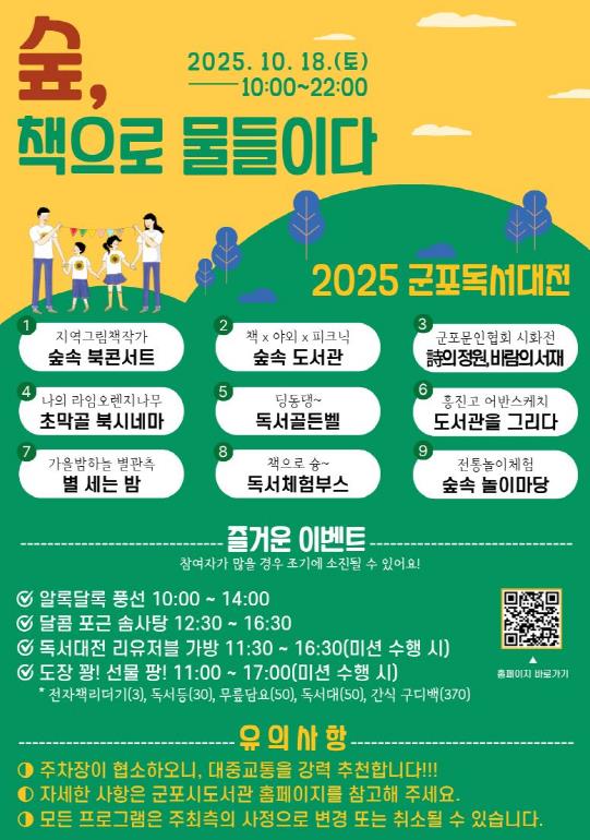 ‘숲, 책으로 물들이다’라는 슬로건 아래 열리는 이번 축제는 시민의 정주의식과 문화적 자긍심을 높이는 군포시 대표 독서축제로 자리매김하고 있다.