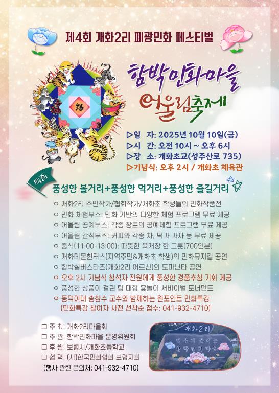 이날 행사는 개화2리 마을회 주최, 함박민화마을 운영위원회 주관으로 진행되며, 개화2리 주민과 협회 작가들의 민화작품 전시회, 다양한 원데이 클래스 민화체험, 각종 장르의 공예 체험 활동, 개화초 학생들과 주민이 함께하는 민화뮤지컬 공연 등이 준비되어 있으며, 식사와 간식도 무료로 제공된다.