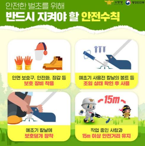 매년 이 시기에는 예초기 날에 의한 손가락·발목 절단, 튀는 돌 조각으로 인한 안면 부상, 연료 취급 부주의로 발생하는 화재 등 다양한 사고가 빈번하게 발생하고 있어 각별한 주의가 요구된다.