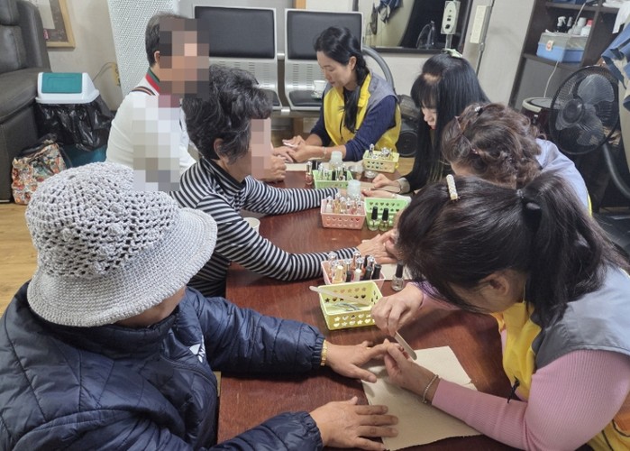 이날 봉사에는 뜸, 압봉(수지침), 이혈요법, 테이핑요법, 발 마사지, 네일아트, 이·미용 등 6개 분야와 장수 사진 촬영의 전문 봉사자 33여 명이 참여해 주민들에게 건강증진과 미용 분야의 재능기부 서비스를 제공했다.